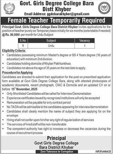 The Government Girls Degree College in Khyber, Khyber Pakhtunkhwa (KPK) has announced new job openings, as published in The News newspaper on October 23, 2025. The college is looking for qualified candidates for the positions of Urdu Teacher and Female Teacher.