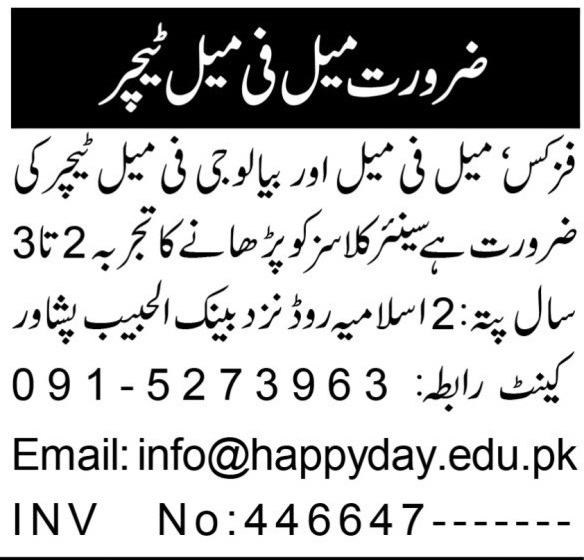 Happyday School System (HSS) Cantt Peshawar, located in Khyber Pakhtunkhwa (KPK), Pakistan, is inviting applications from qualified and eligible candidates for the positions of Teacher, Physics Teacher, Female Teacher, and Biology Teacher. This job announcement was published in the Daily Aaj Newspaper on October 30, 2025. Candidates holding bachelor’s, master’s, or M.Sc. degrees will be given preference.