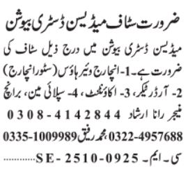 Medicine Company Lahore has announced multiple vacant positions as per the advertisement published in the Daily Jang Newspaper on 25 October 2025. The available posts include Supply Man, Incharge Warehouse, Order Taker, Accountant, Branch Manager, and Store Incharge in Lahore, Punjab, Pakistan.