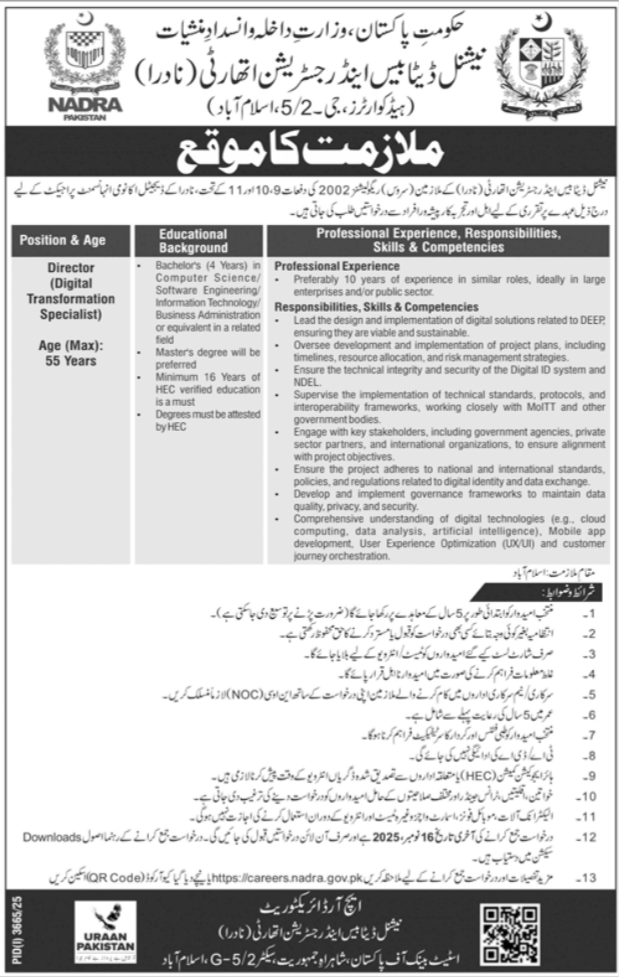 The National Database & Registration Authority (NADRA) has announced job openings as per the advertisement published in the Daily Jang Newspaper on November 2, 2025. Vacant positions include Director and Director Digital Transformation Specialist based in G-5, Islamabad, Pakistan. Candidates holding a Bachelor’s degree or equivalent qualification are eligible to apply.