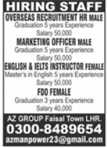 AZ Group Faisal Town Lahore, Punjab, Pakistan is inviting applications from qualified candidates for the positions of Female Front Desk Officer (FDO), Male Marketing Officer, Male Overseas Recruitment HR Officer, and Female English/IELTS Instructor. This job advertisement was published in the Daily Jang Newspaper on October 27, 2025. Candidates possessing Bachelor’s or Master’s degrees are encouraged to apply.