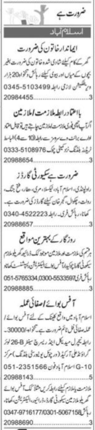A Private Company has announced multiple job openings as per the advertisement published in the Daily Express Newspaper dated October 25, 2025. Applications are invited for the positions of maid, electrician, house maid, cook, office staff, receptionist, security guard, office boy, house worker, driver, sweeper, and chowkidar. The vacancies are based in G-10 Islamabad and Rawalpindi, Pakistan.
