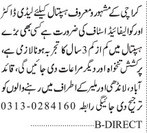 Vacant positions including Lady Doctor and Doctor have been announced at Private Hospital Landhi, Karachi, Sindh, Pakistan, as per the advertisement published in the Daily Jang Newspaper on 10 November 2025. Candidates possessing qualifications such as MBBS or equivalent are eligible to apply.
