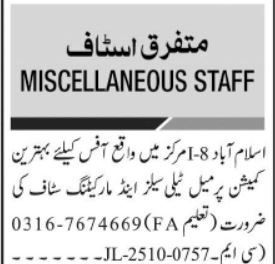 Marketing Company located in I-8 Markaz, Islamabad, Pakistan is inviting applications from qualified individuals for the positions of Telesales Officer, Telesales Staff, and Marketing Staff, as announced in the advertisement published in the Daily Jang Newspaper on October 25, 2025. Candidates holding an Intermediate or equivalent qualification will be given preference.